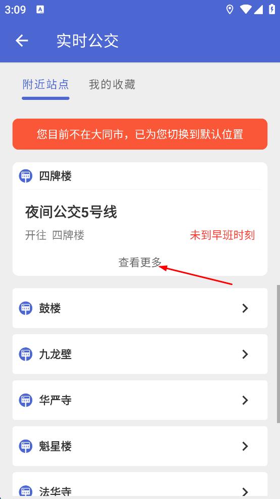 2、在“附近站点”中选择目标线路,点击【查看更多】,即可查看该线路全程站点、车辆实时位置、发车间隔及下一班预计到达时间;
