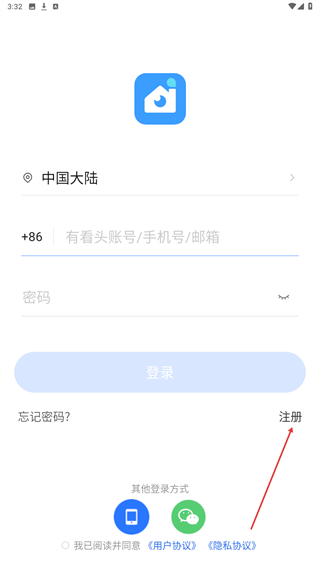 1、打开有看头APP,在登录页点击「注册」按钮。