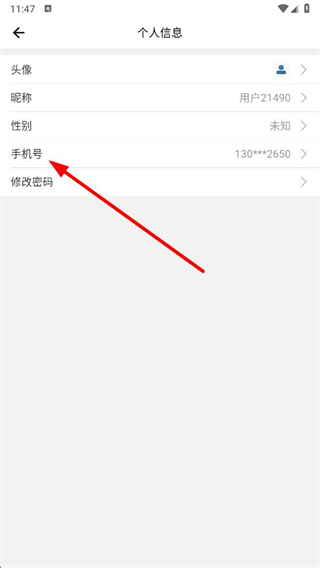 2、在个人信息页中,点击【手机号】一栏,进入修改页面;