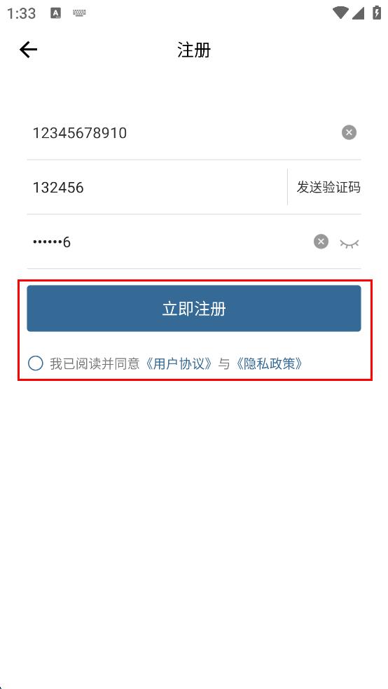 3、输入手机号→获取并填写短信验证码→设置登录密码→勾选《用户协议》与《隐私政策》→点击【立即注册】,即刻启用全部服务。