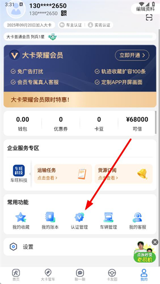 1、打开车旺大卡APP,进入我的页面,在我的页面里,找到认证管理下方的车辆管理选项并点击进入。