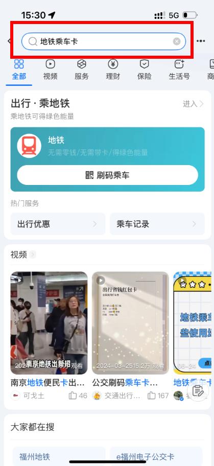 3、在搜索框中输入“地铁乘车卡”,点击结果进入服务页面;