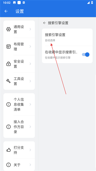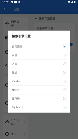 从弹出列表中任选百度、谷歌、必应等常用搜索引擎,完成默认搜索行为定制。