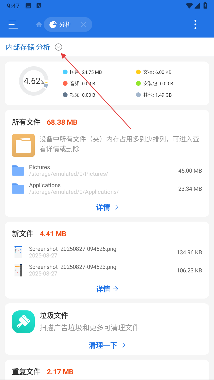 系统将自动扫描并生成内部存储占用热力图;点击【内部存储分析】右侧下拉箭头展开高级分析入口。