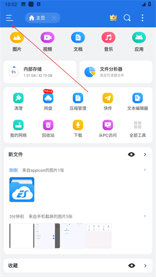 打开ES文件管理器,点击左上角三条横线图标,进入侧边菜单。