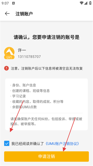 3. 仔细阅读《UMU账户注销协议》→ 勾选确认 → 点击【申请注销】完成操作(注:注销不可逆,请务必提前备份重要数据)。