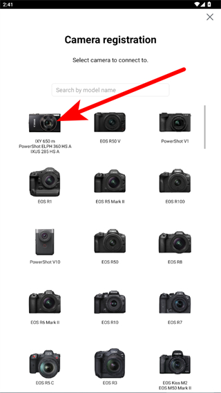 2、在相机注册界面,从完整兼容列表中准确选择您的设备型号(如EOS R6、G7 X Mark III等)。