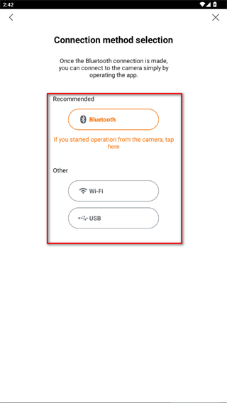 3、选择最适配的连接方式:推荐蓝牙(低功耗、免设置)、Wi-Fi(高速传输)或USB(稳定直连)。若选Wi-Fi,请先在相机端开启「Wi-Fi/NFC」并进入连接模式。