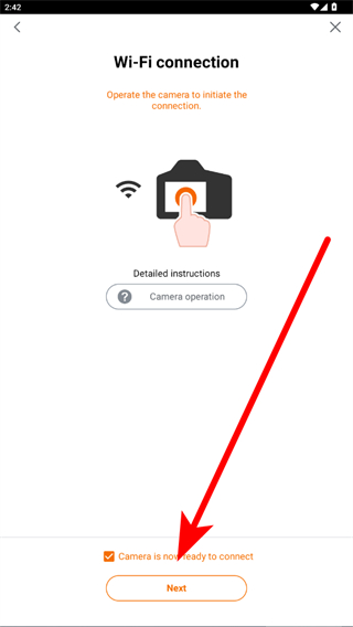 4、以Wi-Fi为例:勾选「Camera is now ready to connect(相机已准备好连接)」,点击Next,严格按APP引导完成SSID匹配与密码确认,即可建立双向通信。