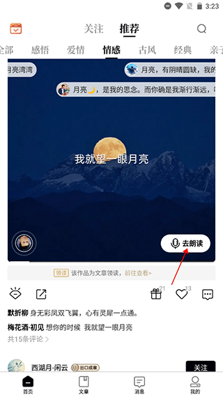 1、「诗词创作」:发布你的原创诗作,让更多人朗读并留下真挚读后感。