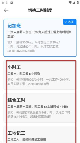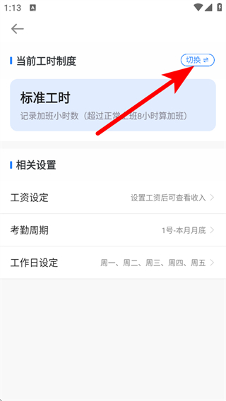 3、点击【切换】,选择适配您所在工厂的工时类型(如综合工时制),确认保存即生效。