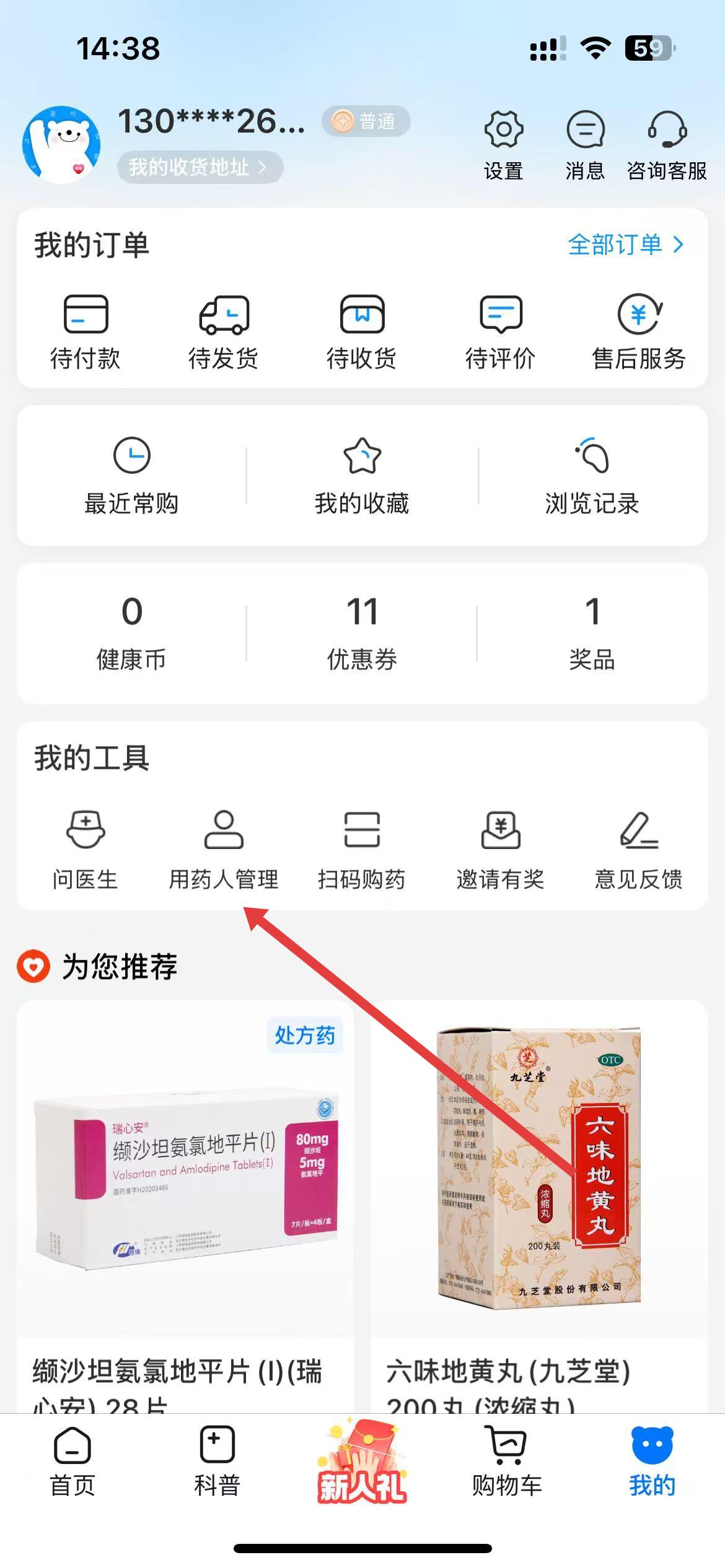 进入【我的】→【我的工具】→【用药人管理】,轻松管理全家健康档案。