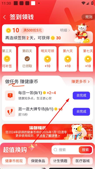 每日坚持签到+完成小任务,健康币稳稳到账,省钱从第一天开始。
