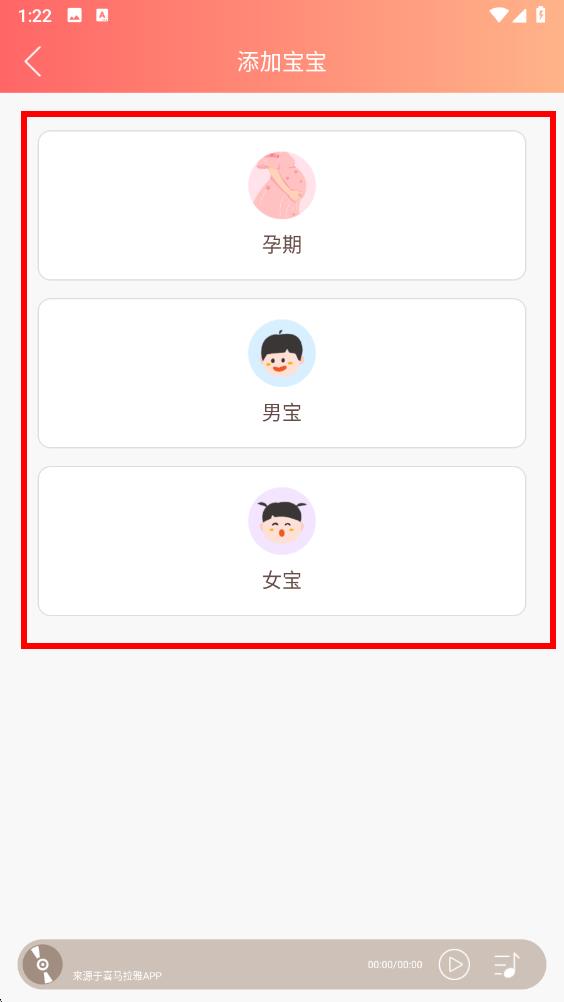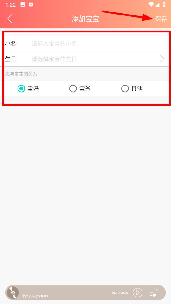 3. 根据实际情况选择「孕期」「男宝」或「女宝」,填写小名、生日及亲子关系,点击右上角「保存」即完成建档。