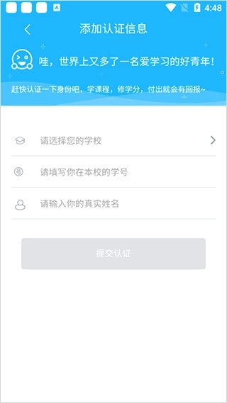 1、首次使用需完成学生身份认证——输入学校、学号、姓名及验证码,绑定所属合作高校学籍信息;