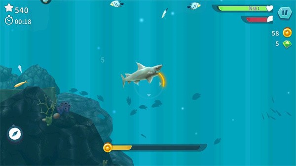 2. 通过触碰屏幕并拖动手指控制鲨鱼移动;按住屏幕不放可触发爆发冲刺,迅速接近猎物或逃离危险。