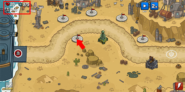 1、下载并启动《蒸汽朋克防御》后,系统将引导你进入初始教学关卡。如图所示,地图上的圆形基座(插有旗帜的位置)即为可建造防御塔的点位,建造所需资源显示在屏幕左上方齿轮图标后的数字中。